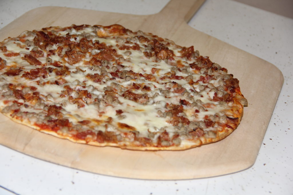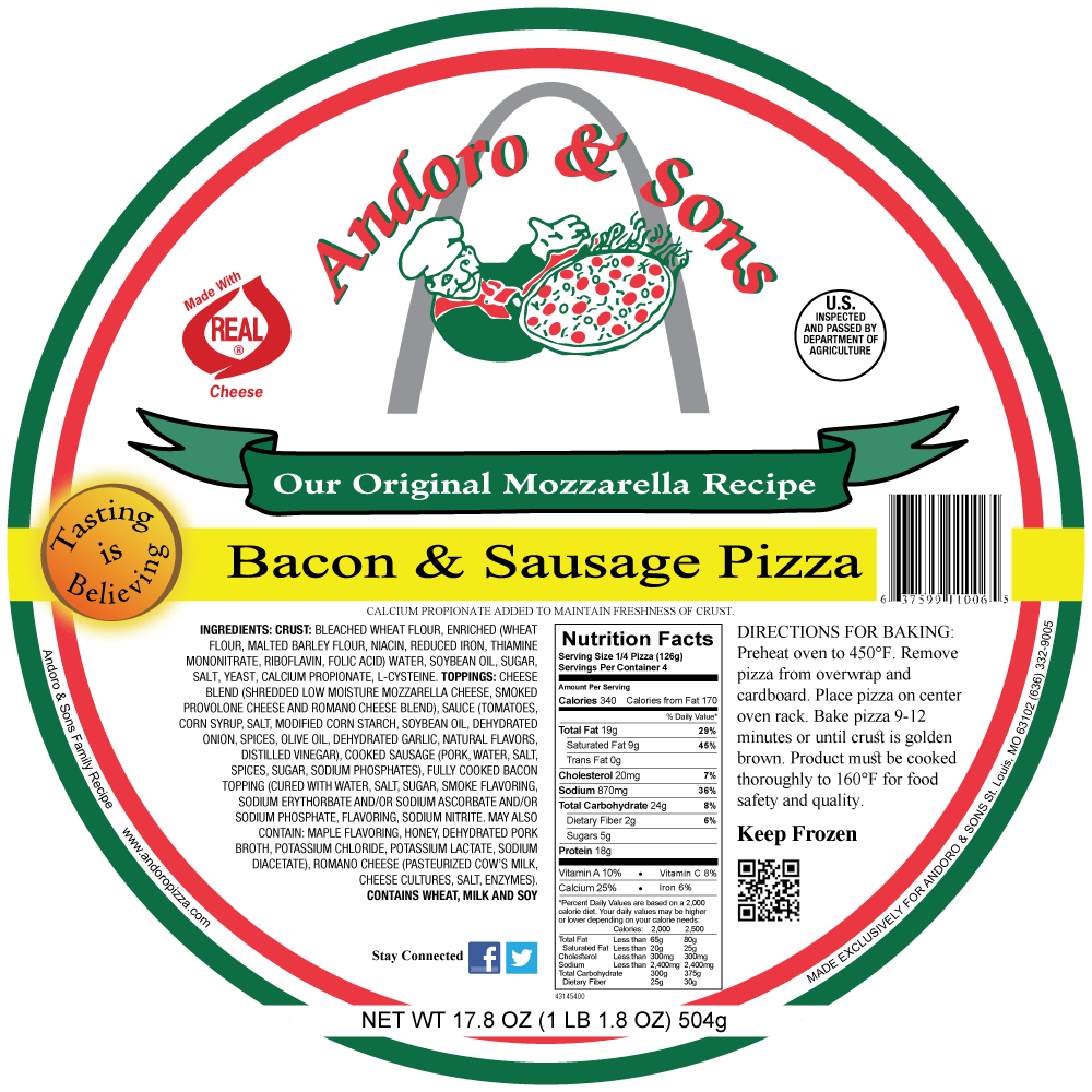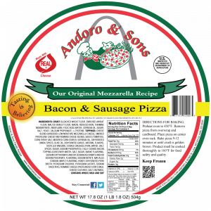 Andoro & Sons Pizza “Our Original Mozzarella” Pizza – a thin crust pizza with Our Original Mozzarella cheese blend topped with our crumbled pork sausage and crispy bacon. It arrives frozen and fresh